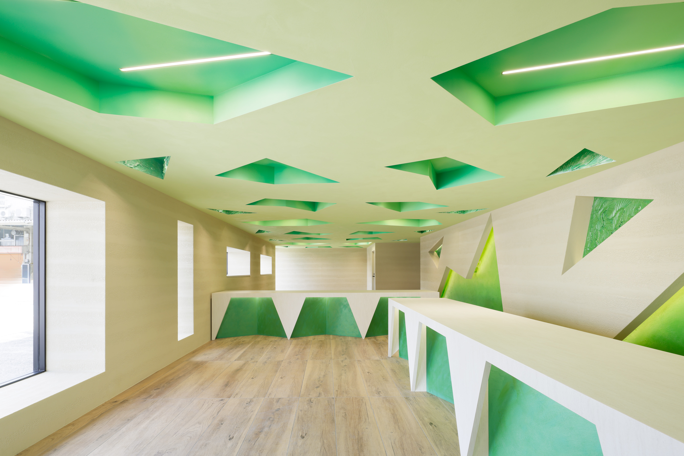 新鮮で生命力溢れるグリーンの多角形体を空間全体に展開し
