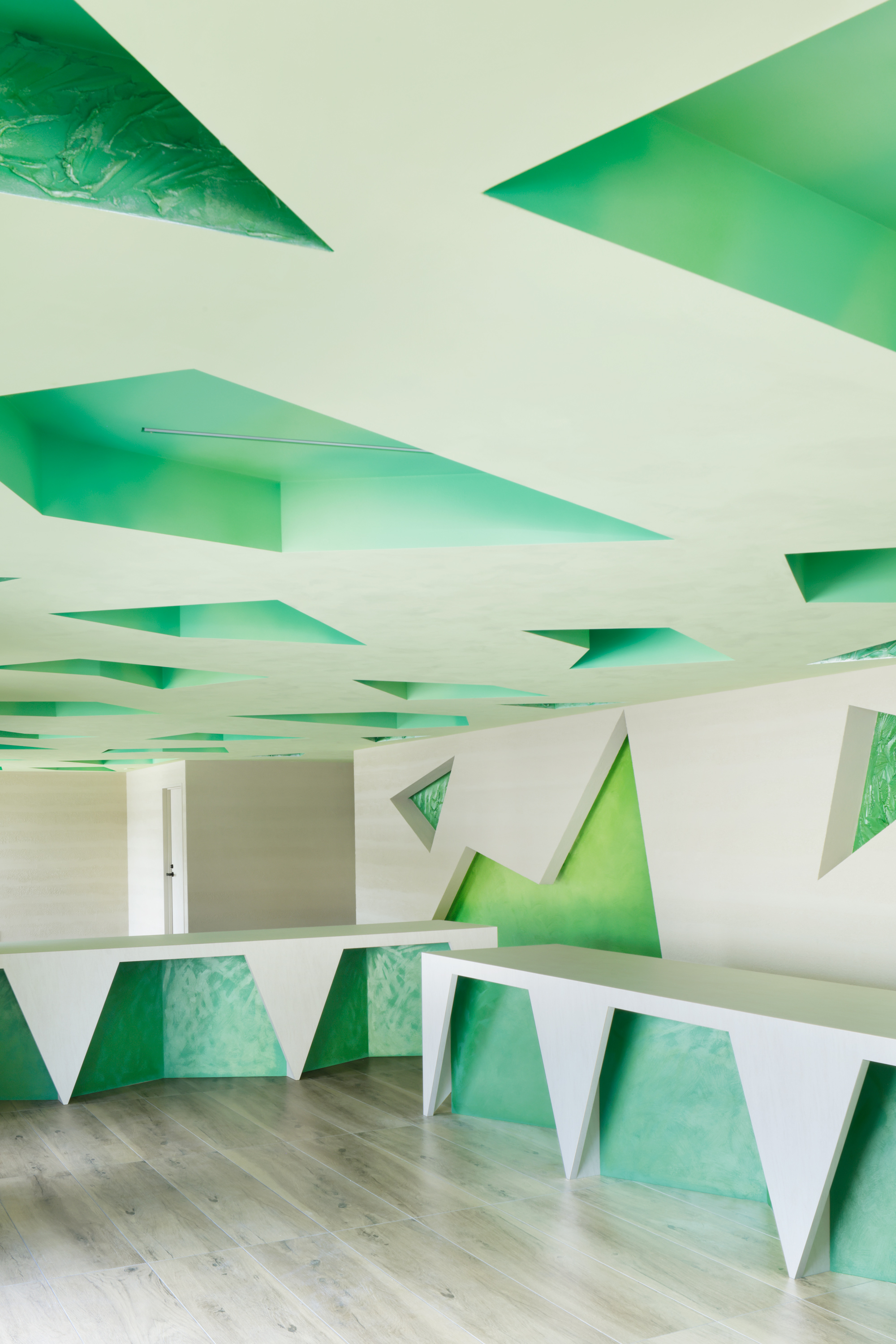 Scattered like fragments of dancing light, these green geometries seem to drift through the air, shaping an atmosphere that wraps the body in living green. Each polygon bears a unique form: on the ceiling, they overlap in delicate gradations reminiscent of layered leaves; on the walls, they radiate a lustrous strength, evoking the vitality of sprouting buds.